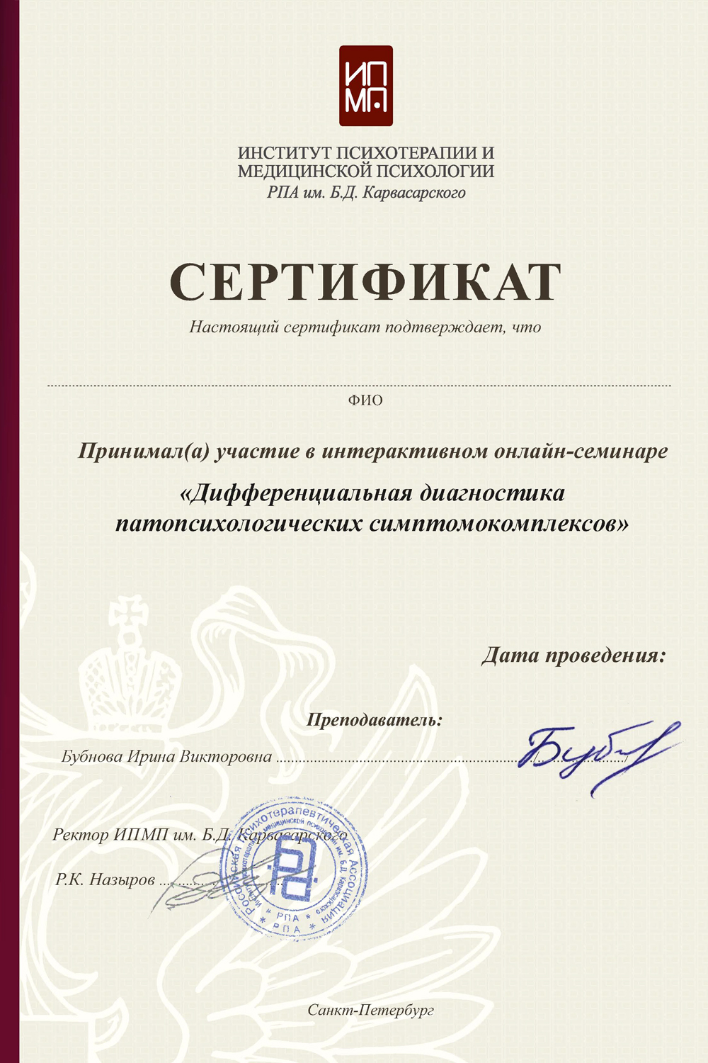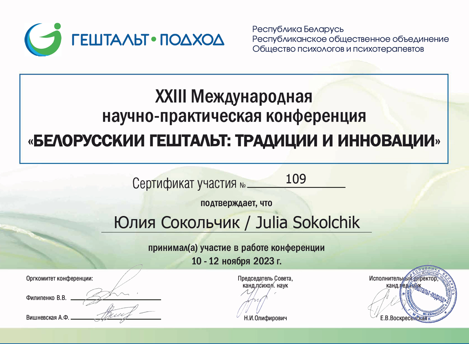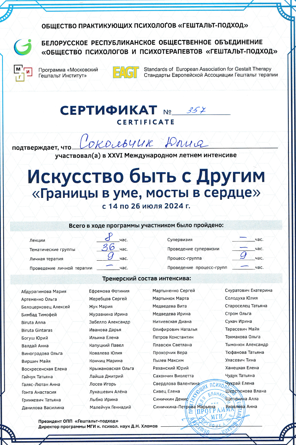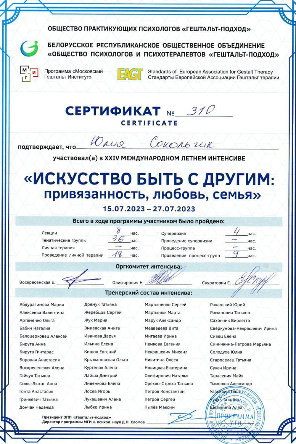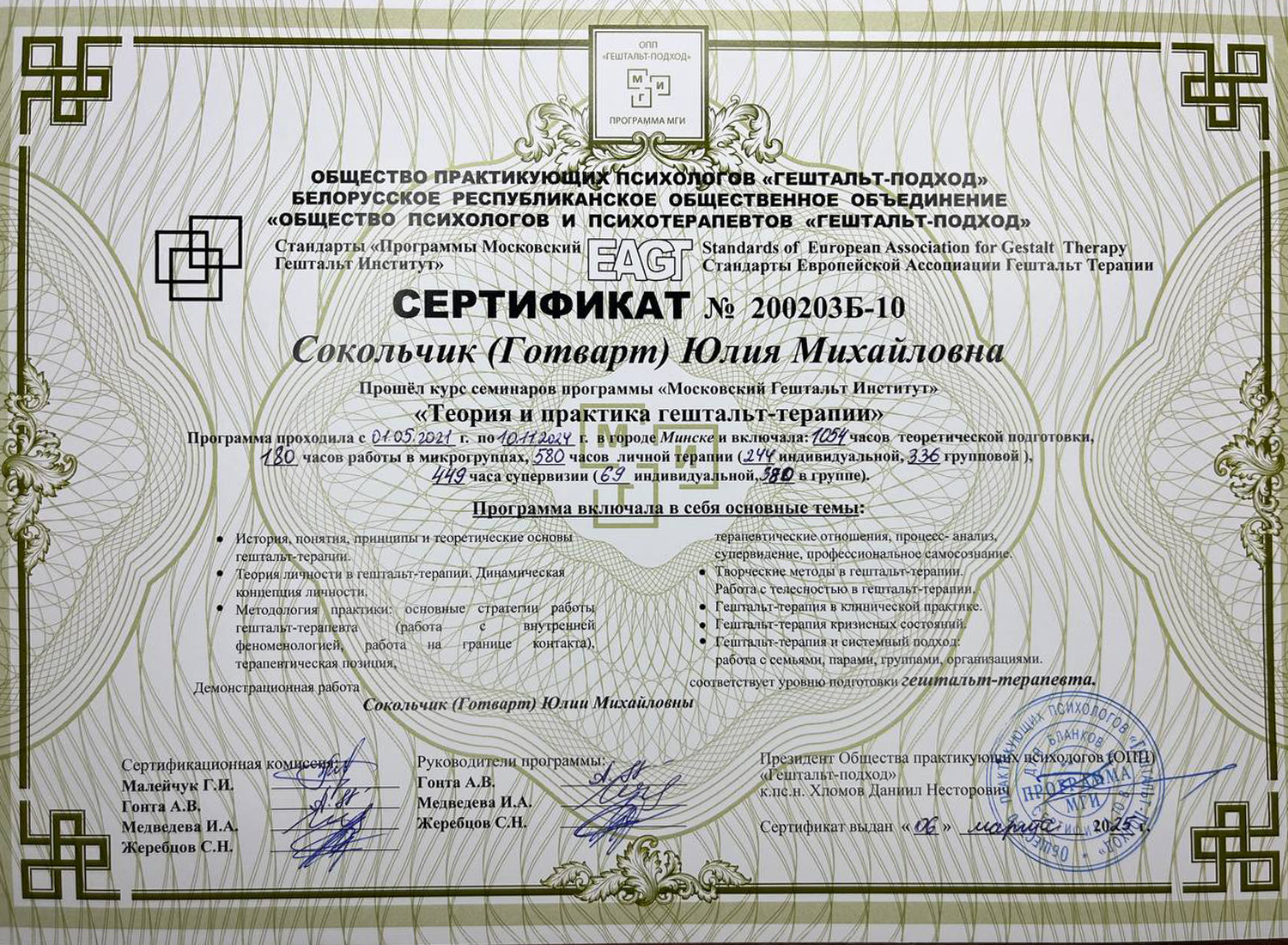Сертификат о членстве в Европейской ассоциации гештальт-терапии