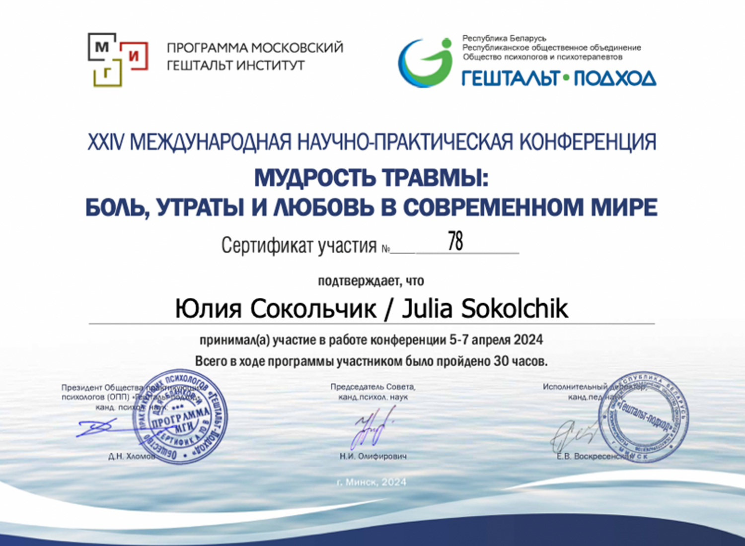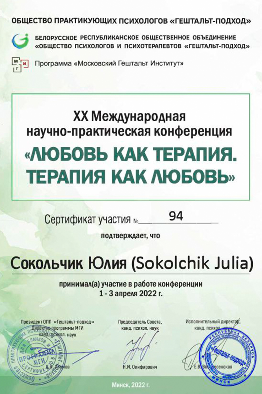 Это большая честь для меня стать действующим членом Европейского сообщества гештальт-терапевтов. Это не просто статус, а обязательство следовать высоким профессиональным и этическим стандартам. Я воспринимаю это как дополнительную ответственность перед каждым клиентом. Я продолжаю регулярно проходить обучение и супервизию, чтобы моя работа оставалась безопасной и эффективной для Вас.