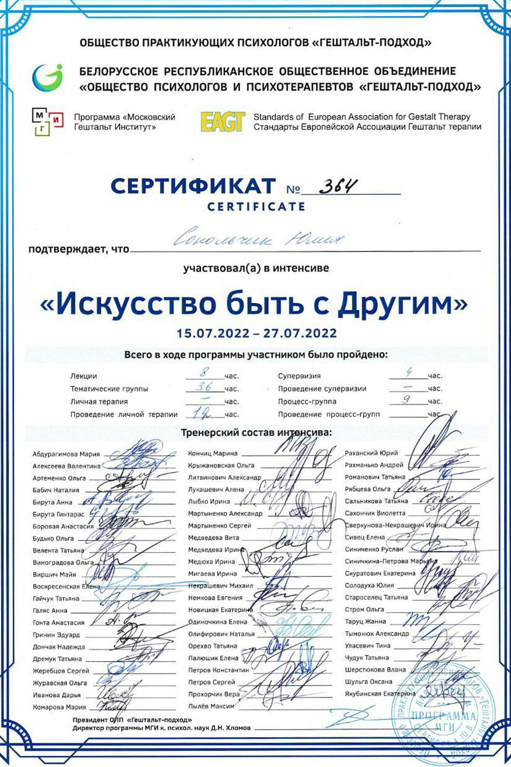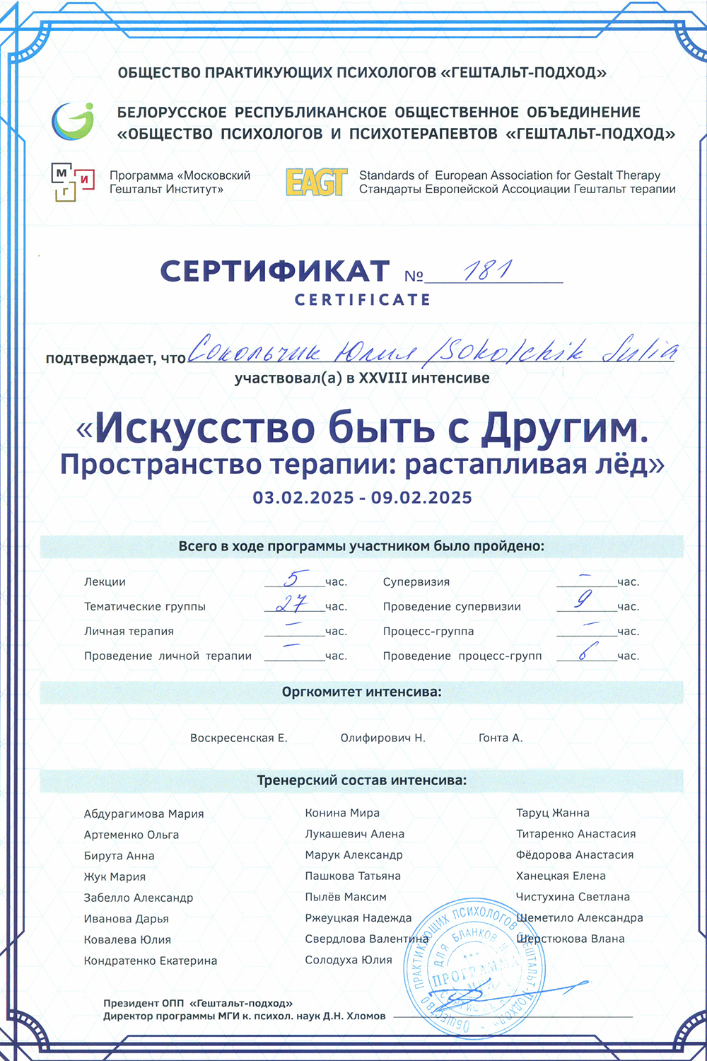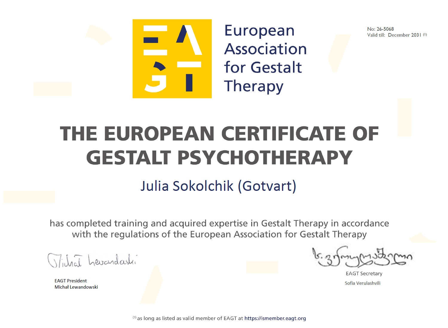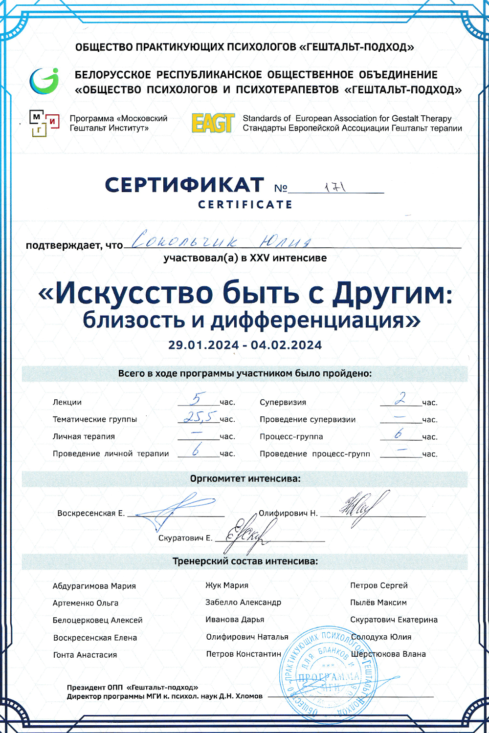 Сертификат о членстве в Европейской ассоциации гештальт-терапии