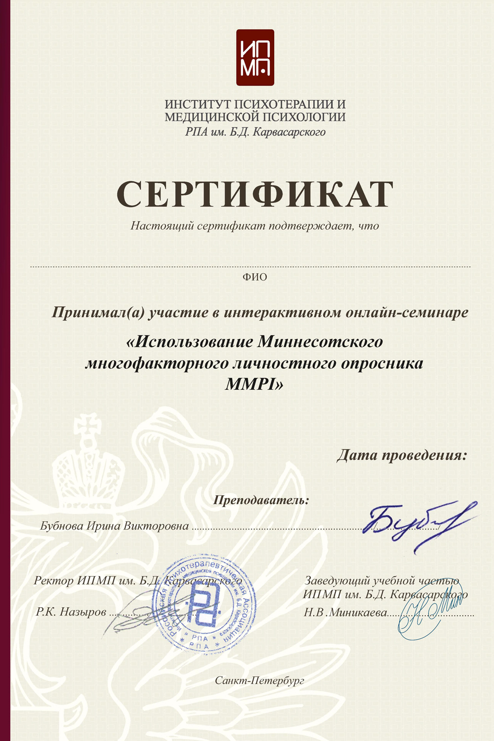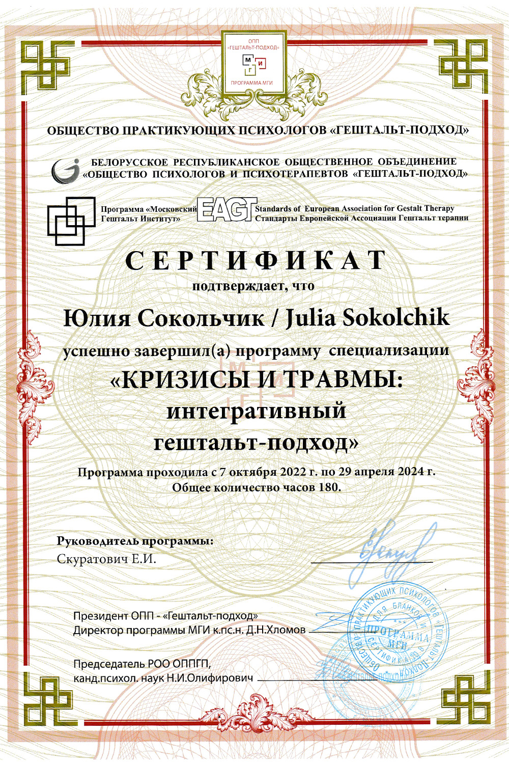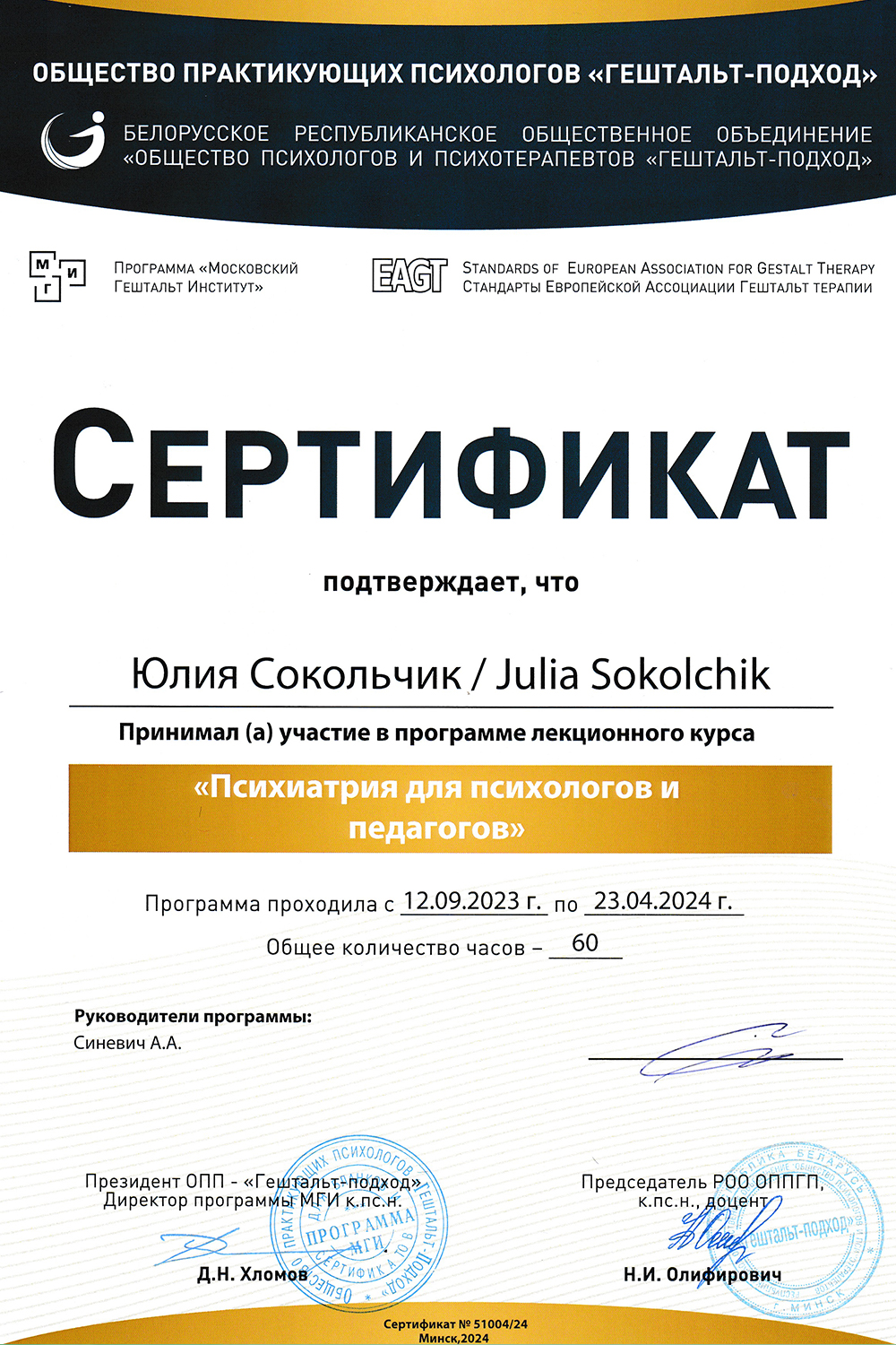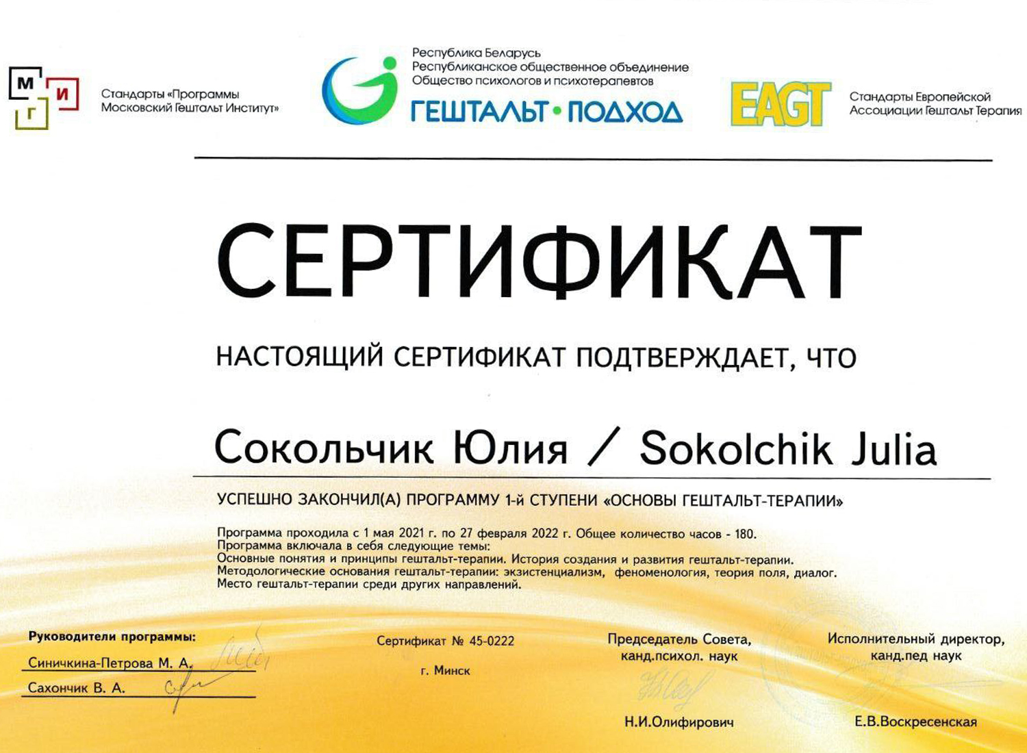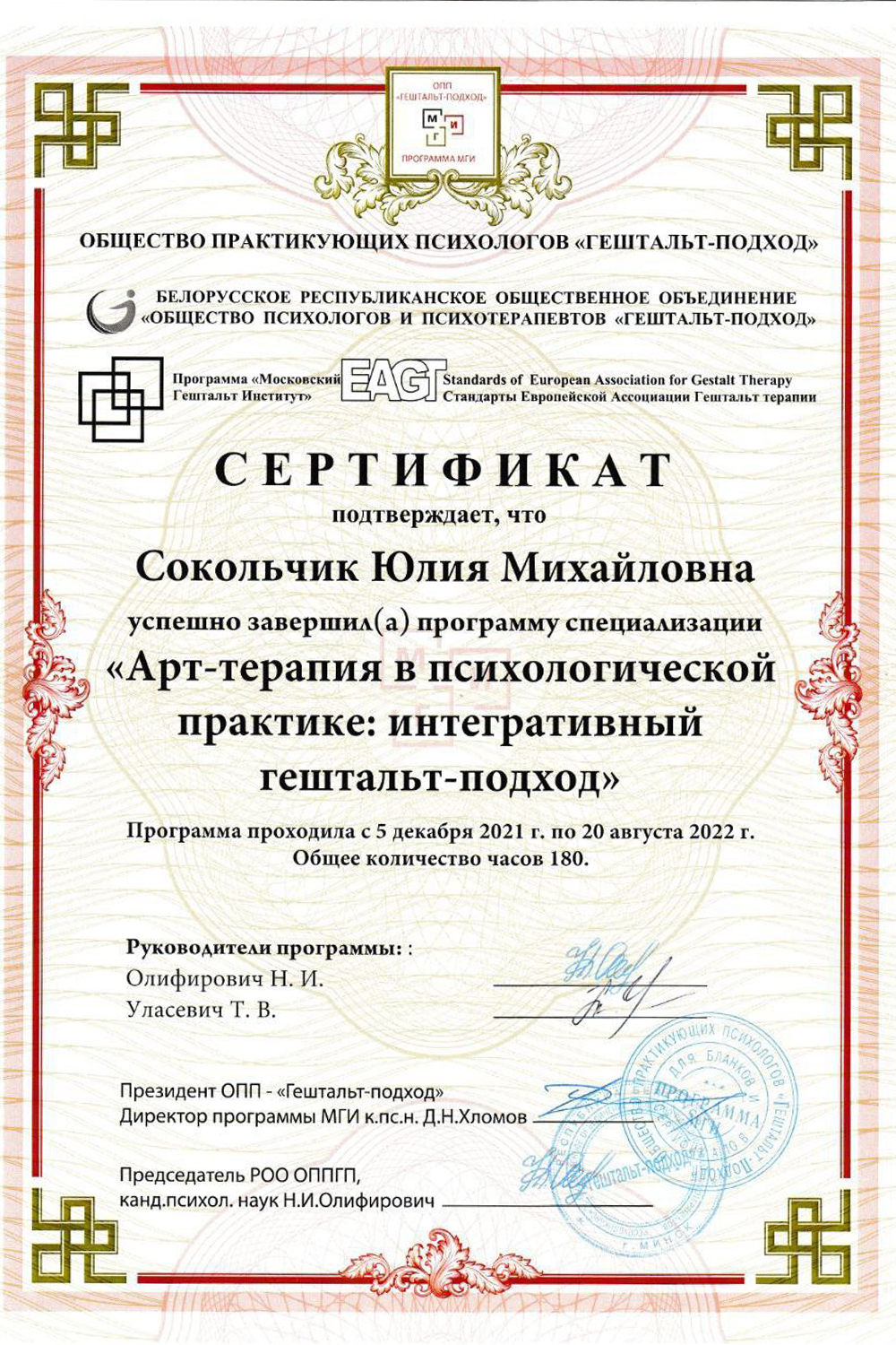 Сертификат о членстве в Европейской ассоциации гештальт-терапии