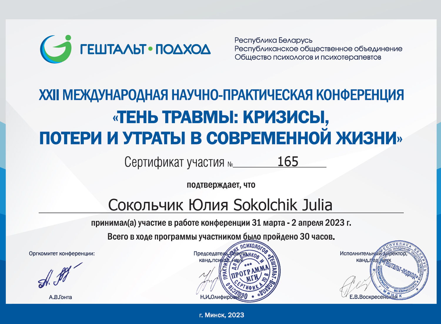 Это большая честь для меня стать действующим членом Европейского сообщества гештальт-терапевтов. Это не просто статус, а обязательство следовать высоким профессиональным и этическим стандартам. Я воспринимаю это как дополнительную ответственность перед каждым клиентом. Я продолжаю регулярно проходить обучение и супервизию, чтобы моя работа оставалась безопасной и эффективной для Вас.